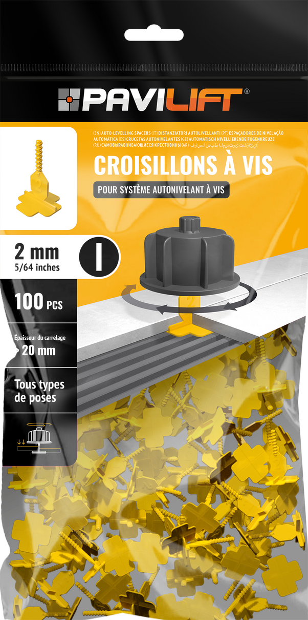 Dénomination | CROISILLON - "I" Autonivelant à vis Tous types de poses - épaisseur 3 à 18 mm - Modèle : 2 mm - sachet de 100 pièces - Couleur : Jaune - Référence : CR120SJ PAVILIFT [CR120SJ] |