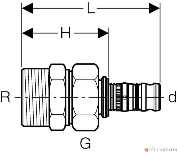 Descriptif fournisseur | Raccord union Geberit Mepla avec filetage mâle: d=20mm, R=1/2'', G=3/4'' |