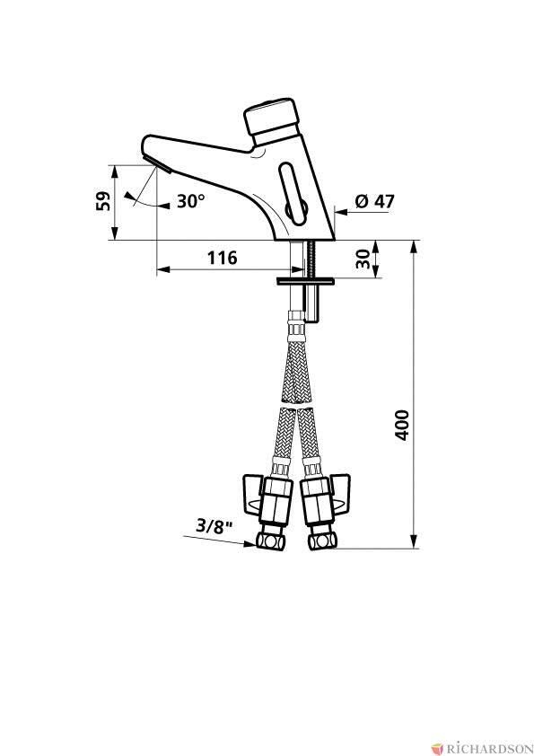 Modèle | Temporisation ~7 secondes. Débit préréglé à 3 l/min à 3 bar, ajustable de 1,4 à 6 l/min. Brise-jet antitartre inviolable. Corps en laiton massif chromé. Flexibles PEX F3/8" avec robinets d'arrêt, filtres et clapets antiretour. Fixation renforcée par 2 tiges Inox. Réglage de température latéral avec manette standard et butée de température réglable. Système antiblocage AB : écoulement uniquement lorsque le bouton poussoir est relâché. Garantie 10 ans. |