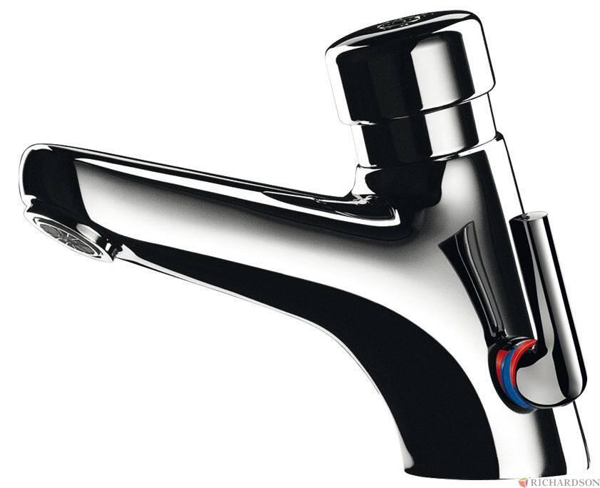 Mitigeur de lavabo temporisé sur vasque - Modèle Temporisation ~7 secondes. Débit préréglé à 3 l/min à 3 bar, ajustable de 1,4 à 6 l/min. Brise-jet antitartre inviolable. Corps en laiton massif chromé. Flexibles PEX F3/8" avec robinets d'arrêt, filtres et clapets antiretour. Fixation renforcée par 2 tiges Inox. Réglage de température latéral avec manette standard et butée de température réglable. Système antiblocage AB : écoulement uniquement lorsque le bouton poussoir est relâché. Garantie 10 ans. - Finition Chromé - Référence 700001