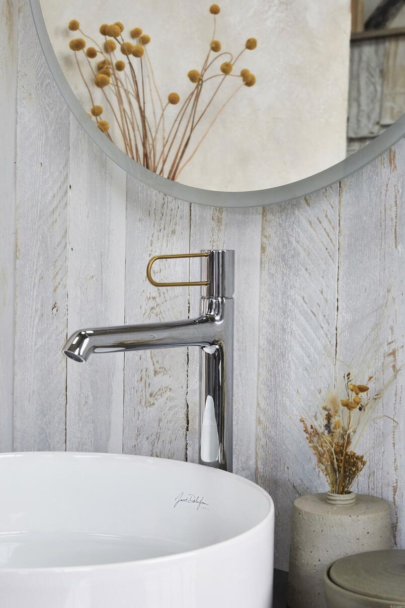 Modèle Hauteur totale : 15,8 cm, saillie du bec : 12,3 cm. Débit : 5 L/min. Poignée en inox ultra robuste - Finition Corps chromé avec poignée dorée - Référence E21028-GLD-CP