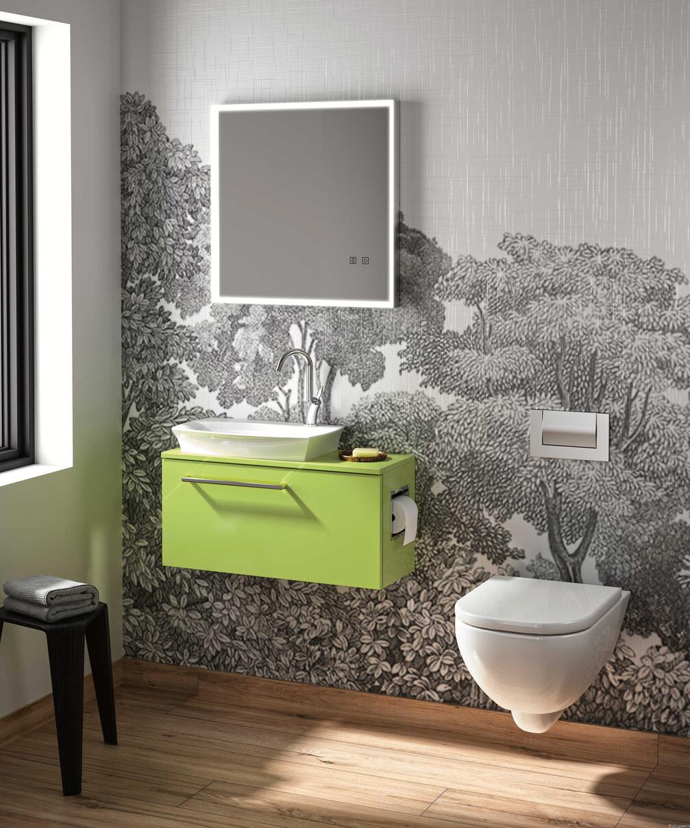 Modèle Comprenant : Meuble lave-mains suspendu ESQUISSE CABINE - Offre un rangement caché par une porte basculante - Sans trop-plein - vasque en Céramique à gauche, très résistante aux tâches, aux rayures, à la chaleur et aux UV avec dérouleur réversible -25 couleurs de laque disponibles en mat ou brillant + 5 métallisées - Dimensions L 70 x H 42 x P 29 cm - Finition Bambou brillant - Laque garantie sans styrène ni formaldéhyde - Référence 1817101