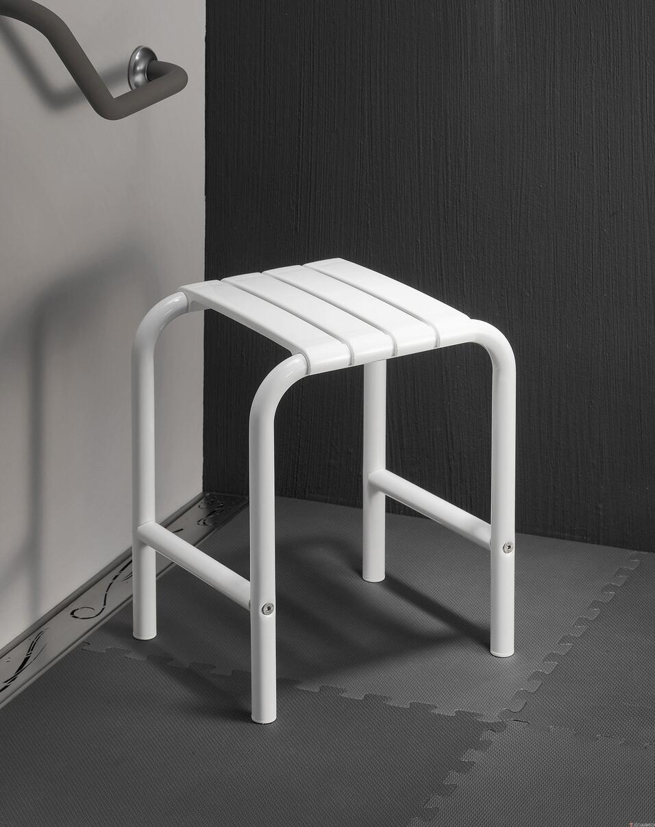 Descriptif fournisseur | Tabouret de douche assise standard, 4 lattes polypropylène, blanc, 335 x 385 x 485 mm, pied tube aluminium époxy blanc Ø 30 mm, 4 patins plastique anti-dérapant, livré démonté, famille : confort et sécurité |